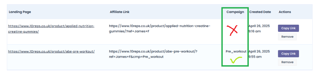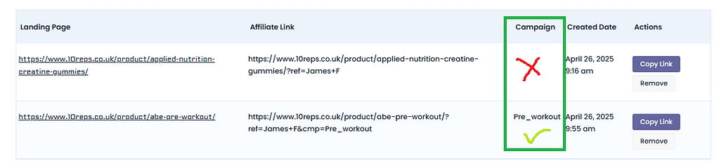 Campaigns are ways to organise your affiliate links into different campaigns. This way you can organise all your pre workout links into a pre workout campaign for example.