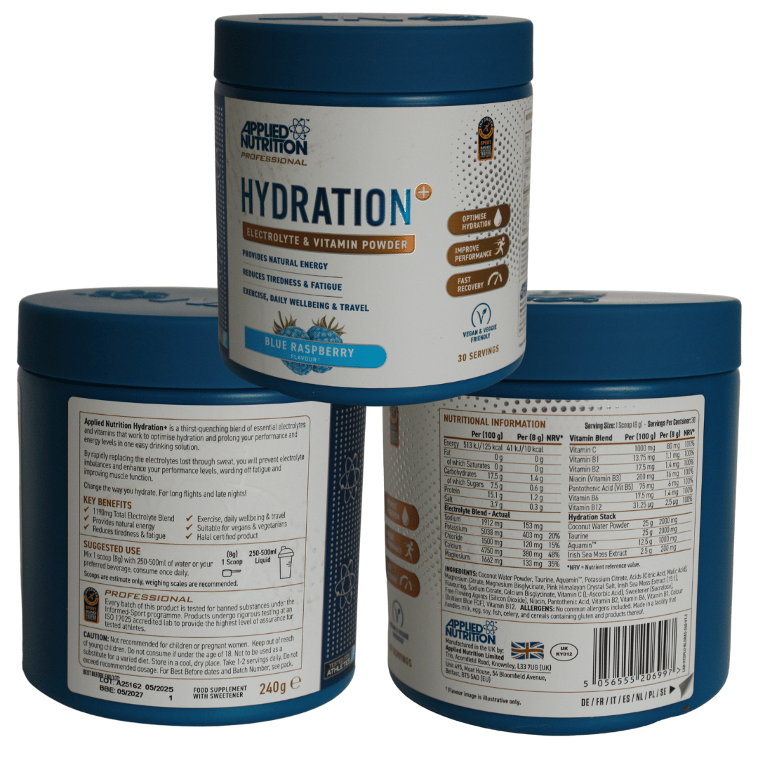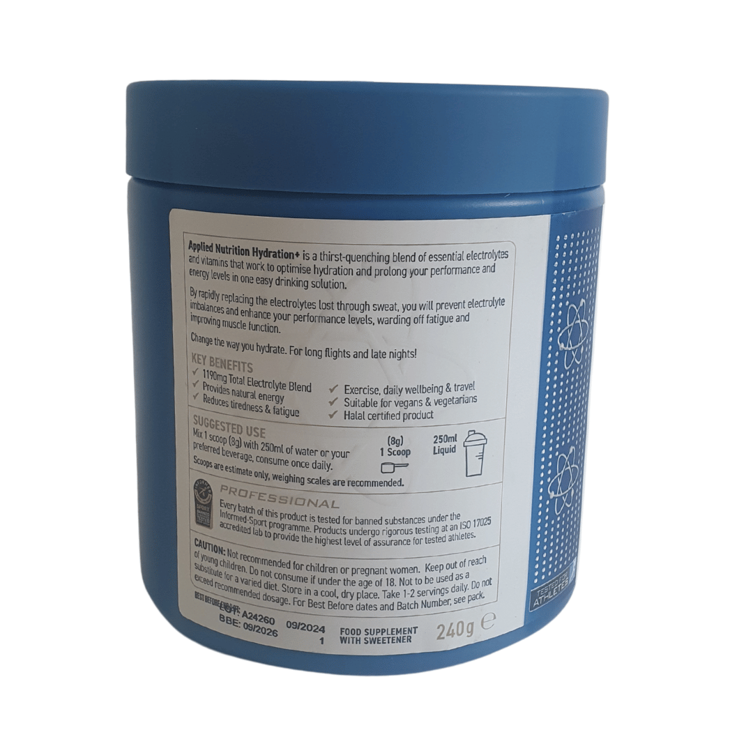Applied Nutrition Hydration+ is a powerful, refreshing blend of essential electrolytes and vitamins designed to keep your hydration and energy levels optimised all day. Whether you’re training hard, travelling, or just need a daily wellness boost, this easy-to-mix hydration formula supports physical performance, reduces fatigue, and helps balance electrolytes lost through sweat.
