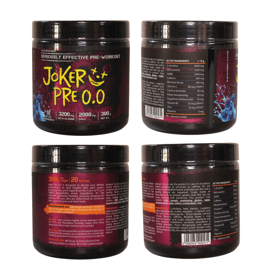 Joker Pre 0.0 is a powdered food supplement intended for use before physical training. Each 15g serving includes a blend of commonly used pre-workout ingredients such as L-Citrulline, Beta-Alanine, AAKG, and Caffeine, as well as a selection of vitamins and botanical extracts.